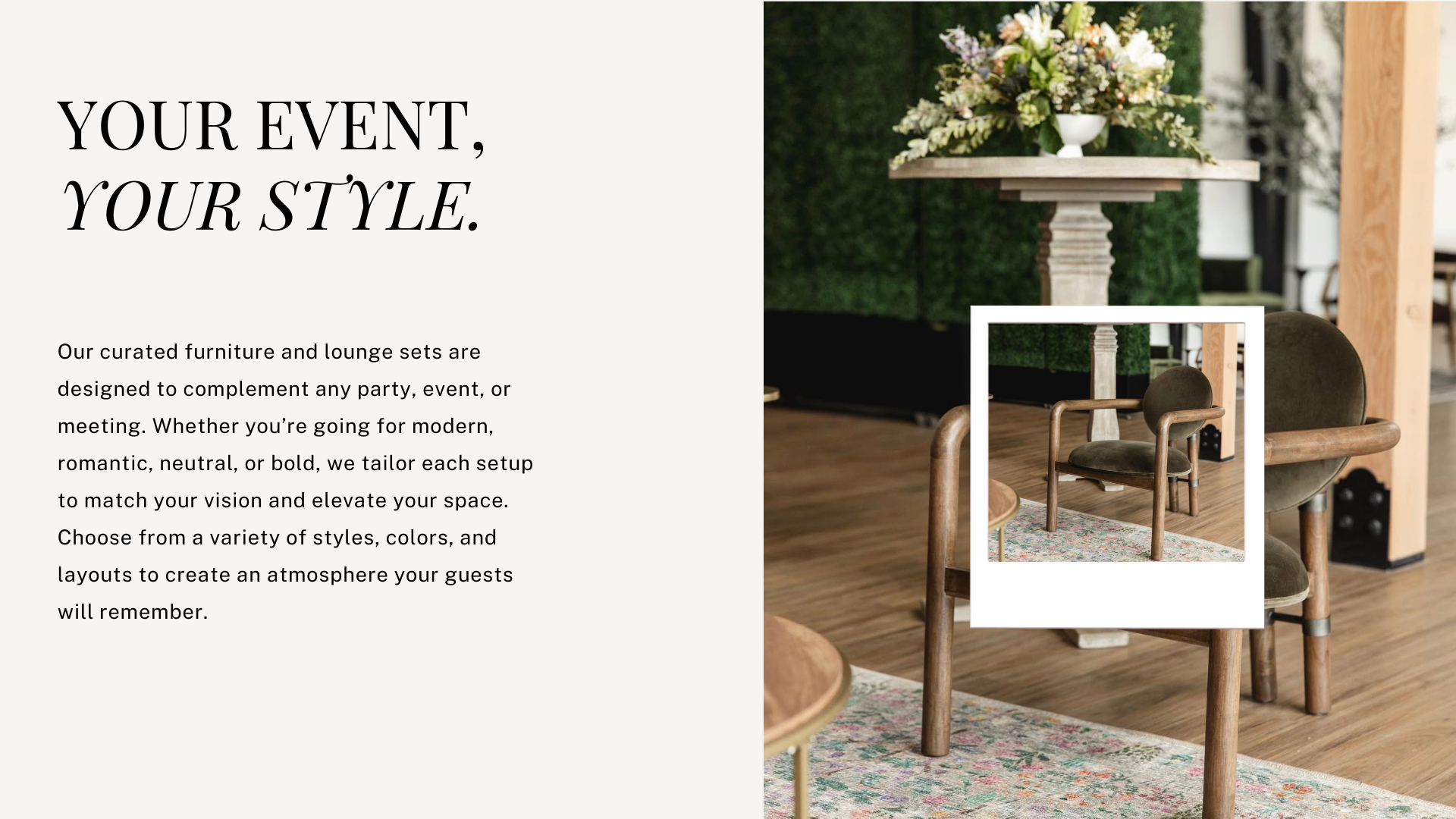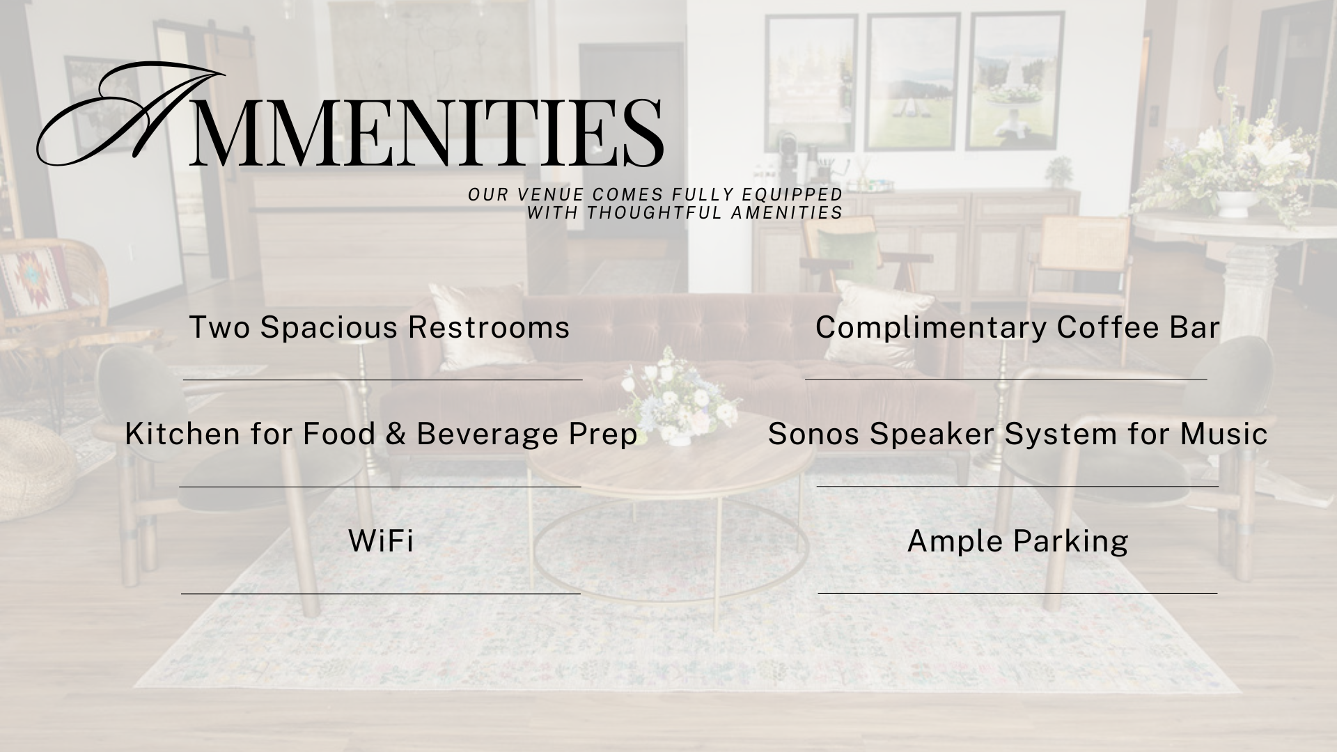 Whether you’re hosting an intimate celebration, a bridal shower, a workshop, or a small private gathering, our venue offers a warm, versatile backdrop that can be transformed to match your vision. With a selection of furniture, décor, and layout options, we curate each setup with intention—ensuring your event feels cohesive, stylish, and uniquely yours.